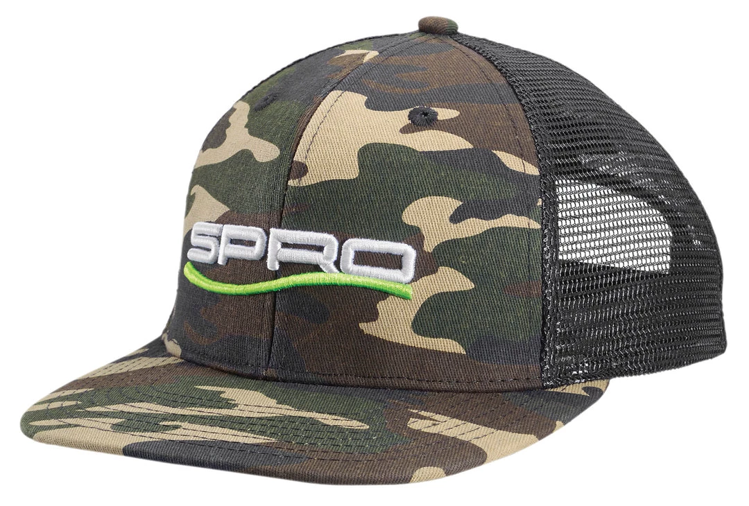 Trucker hat with Exclusive SPRO Camo Patter and White Lettered SPRO logo with a green Swoosh.Â